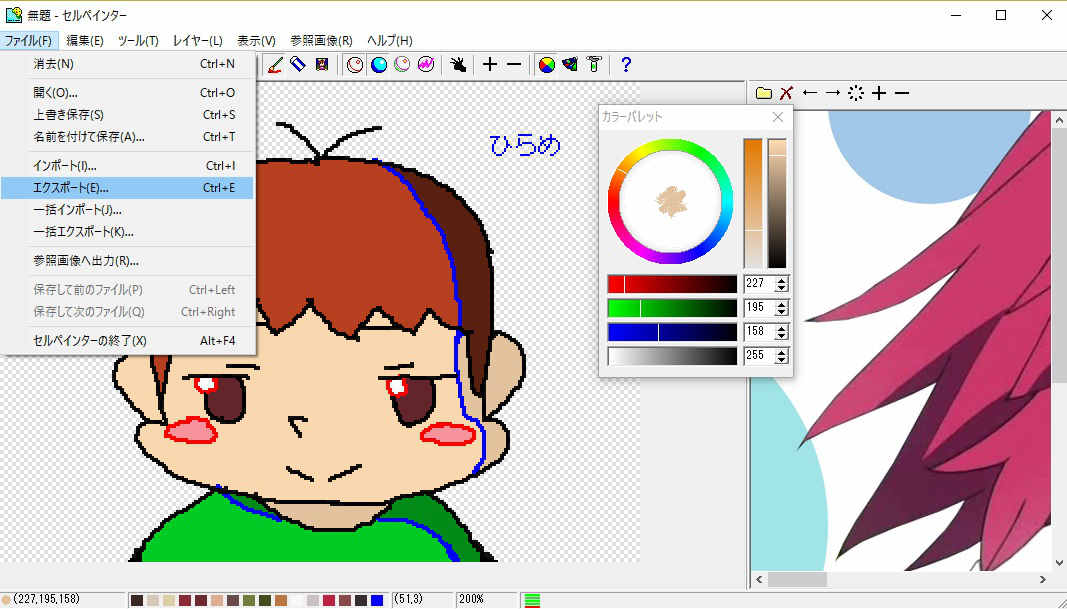 5、色が塗れたら、最後はデータの保存です。「ファイル」→「エクスポート」で色塗りしたデータを保存。完成です。